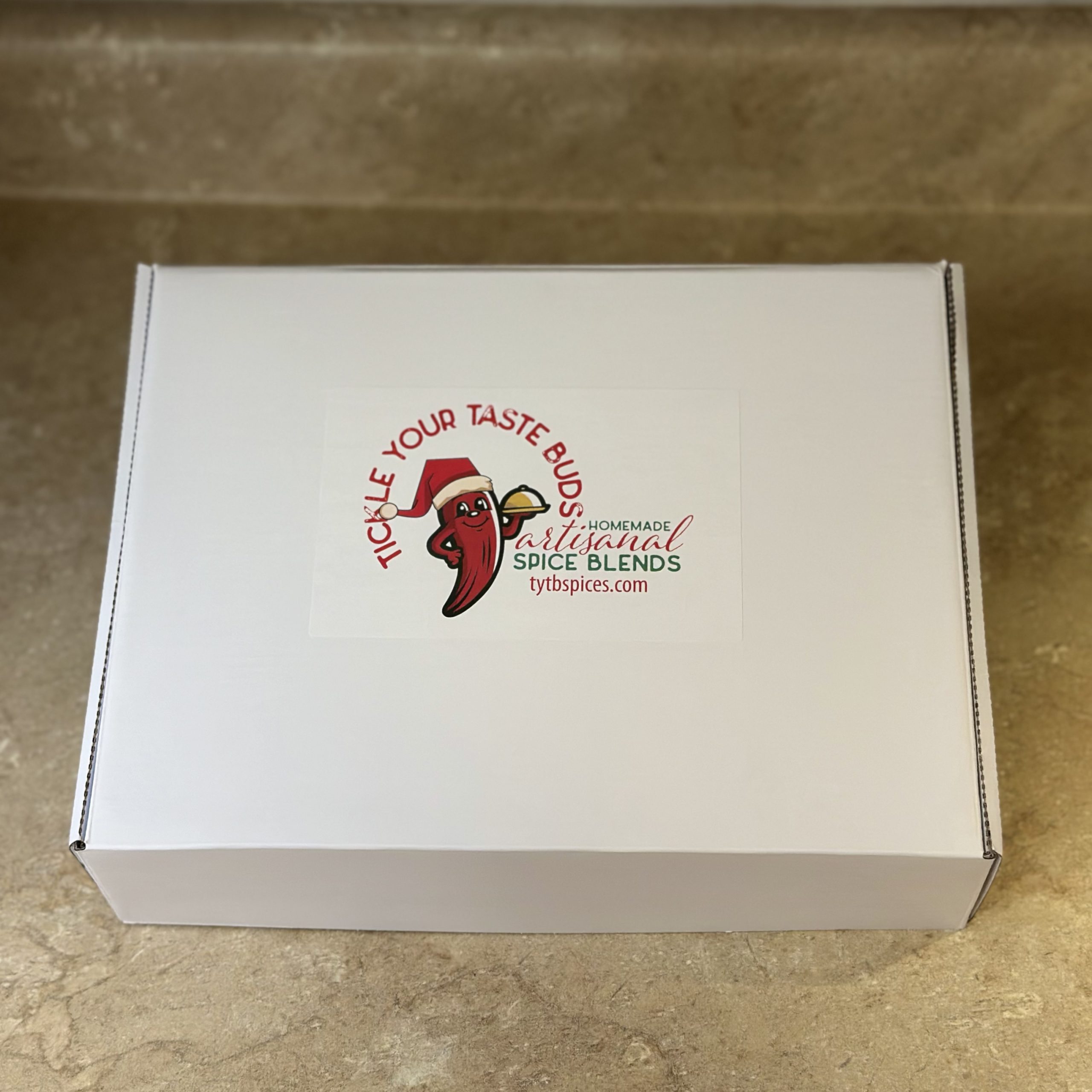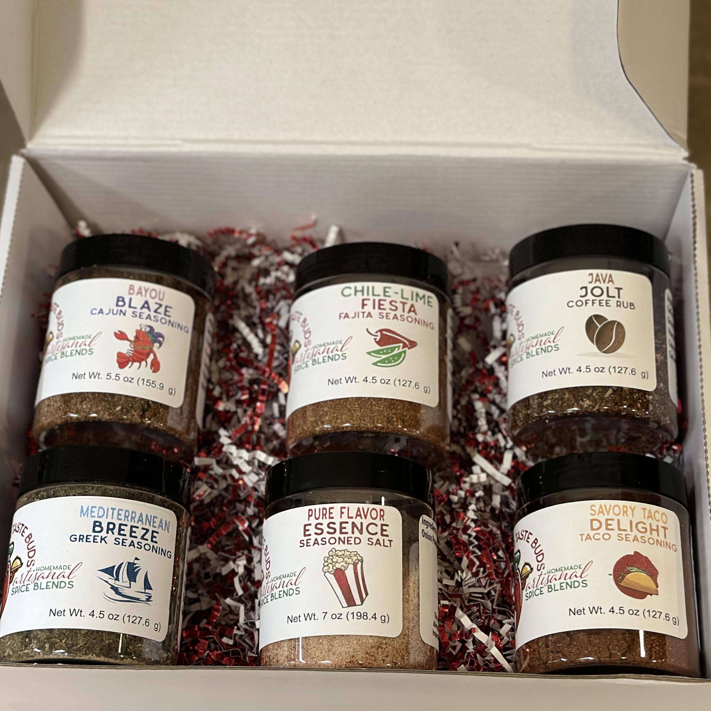 Sure to add some spice to anyone’s Christmas, this gift box contains one of each of our seasoning blends (hot chocolate excluded) in a white gift box with red and white crinkled filler paper. You can select either pouches or jars.